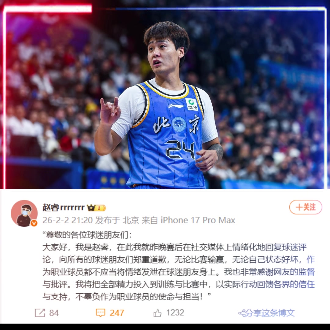 >😮赵睿在社媒上向球迷致歉:不该将自己的情绪发泄在球迷身上!感谢网友批评!
