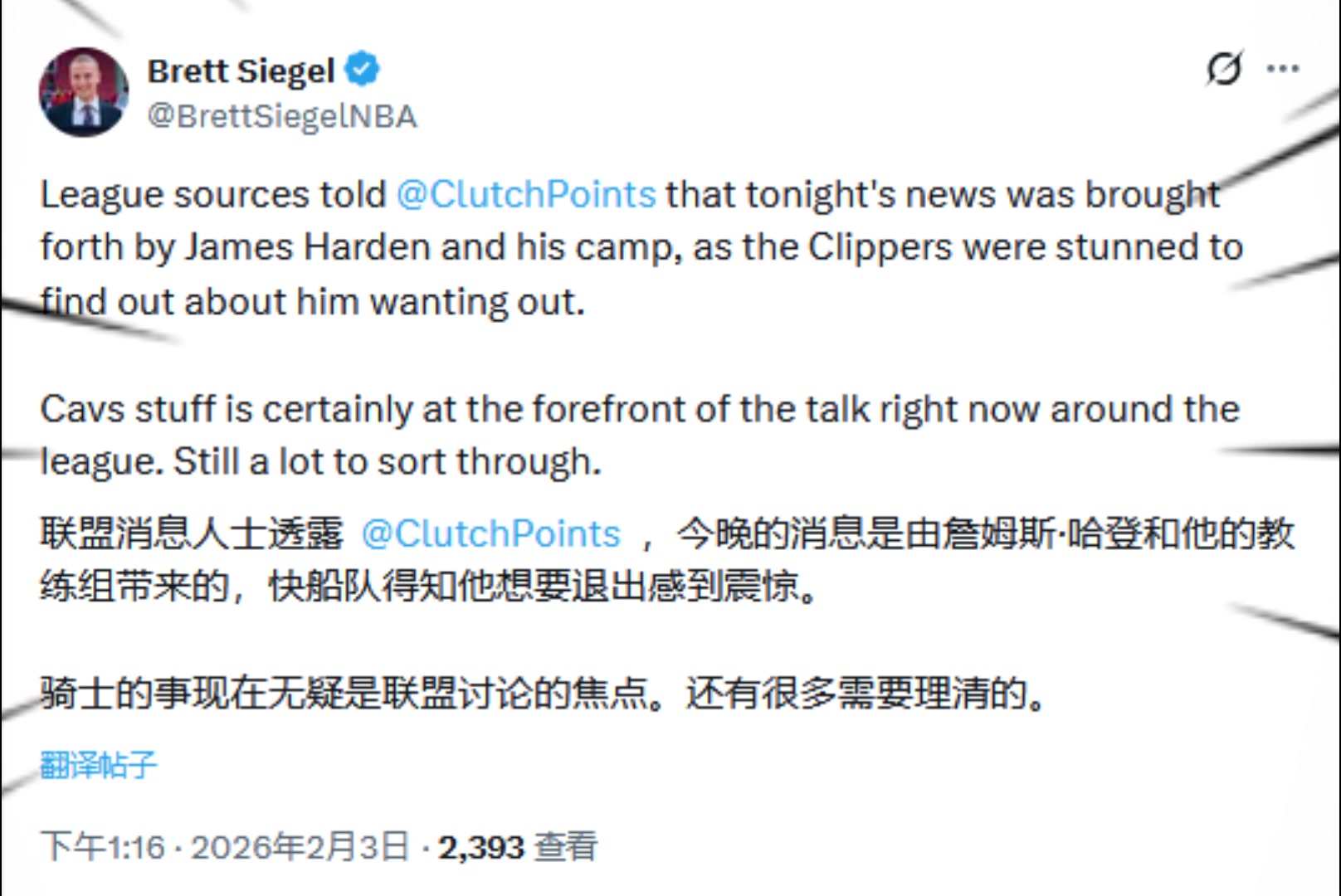 >名记Siegel爆料:是哈登提出离队想法,快船得知后很震惊但同意了